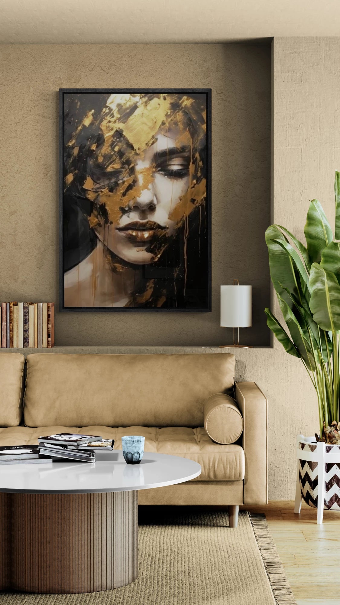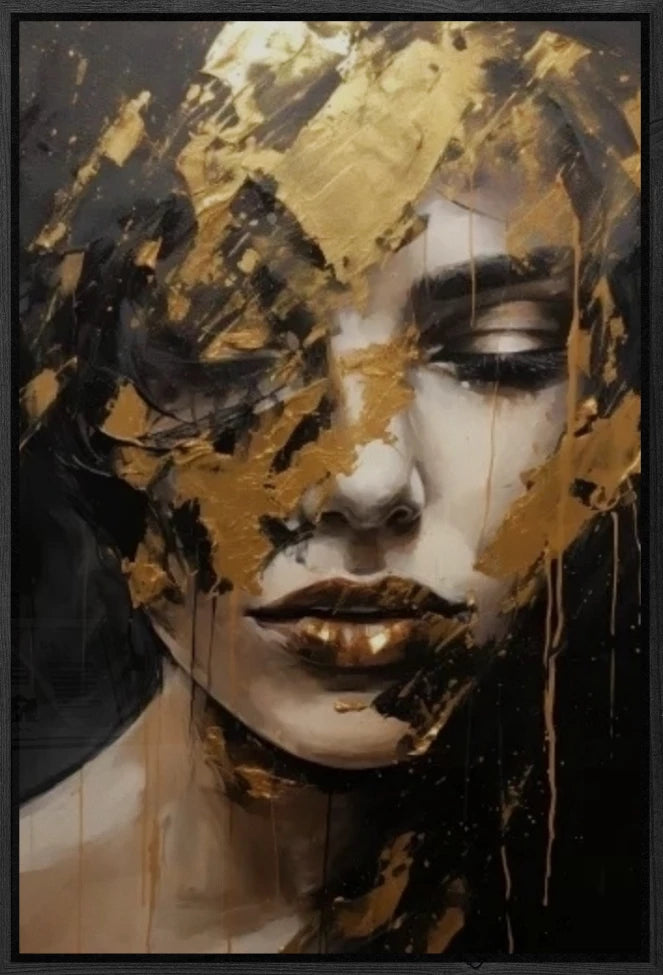 Camilla van Bas! is een betoverend portret dat een sterke emotionele impact heeft. De combinatie van zachte, expressieve gezichtsuitdrukkingen met gedurfde gouden accenten creëert een fascinerend contrast. De penseelstreken en spetters van goud lijken bijna te bewegen, waardoor het kunstwerk een dynamische en intrigerende uitstraling krijgt. Camilla is niet alleen een visuele blikvanger, maar ook een kunstwerk dat verhalen en emoties oproept.
