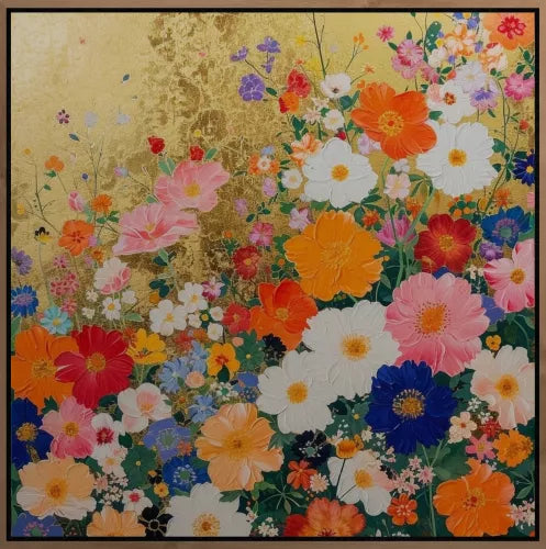 "Colorful van Bas! is een explosie van bloemenpracht, subtiel gecombineerd met gouden accenten. De kleurrijke bloemen op een elegante gouden achtergrond zorgen voor een sprankelend geheel dat direct de aandacht trekt. Dit werk straalt positiviteit en vrolijkheid uit en geeft een moderne draai aan de tijdloze schoonheid van de natuur. Het is perfect om een ruimte op te fleuren en een unieke, levendige sfeer te creëren.