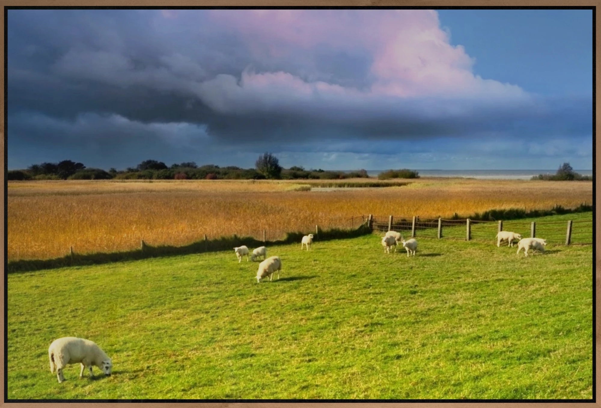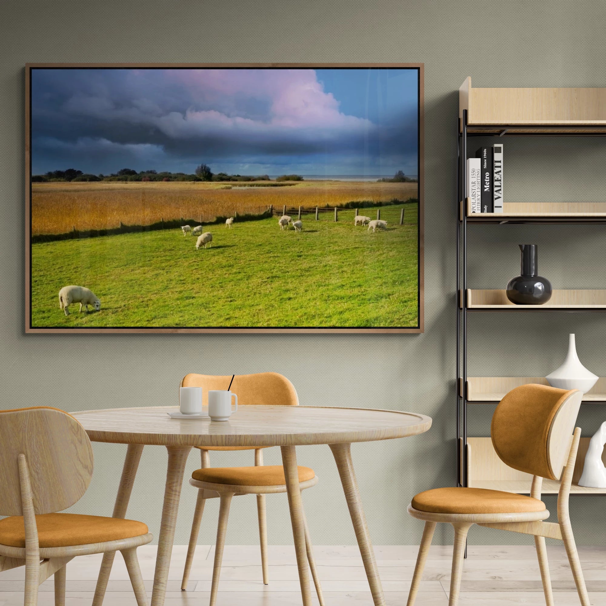 Dutch Fields van Martin Rijpstra vangt het tijdloze karakter van de uitgestrekte Nederlandse weiden, waar schapen rustig grazen onder een indrukwekkende hemel. De warme goudgele tinten van het riet en het frisse groen van de weilanden contrasteren prachtig met de dreigende blauwe lucht, wat het werk een dynamische en toch serene uitstraling geeft. Dit kunstwerk brengt een stukje landelijke charme en kalmte naar je interieur.