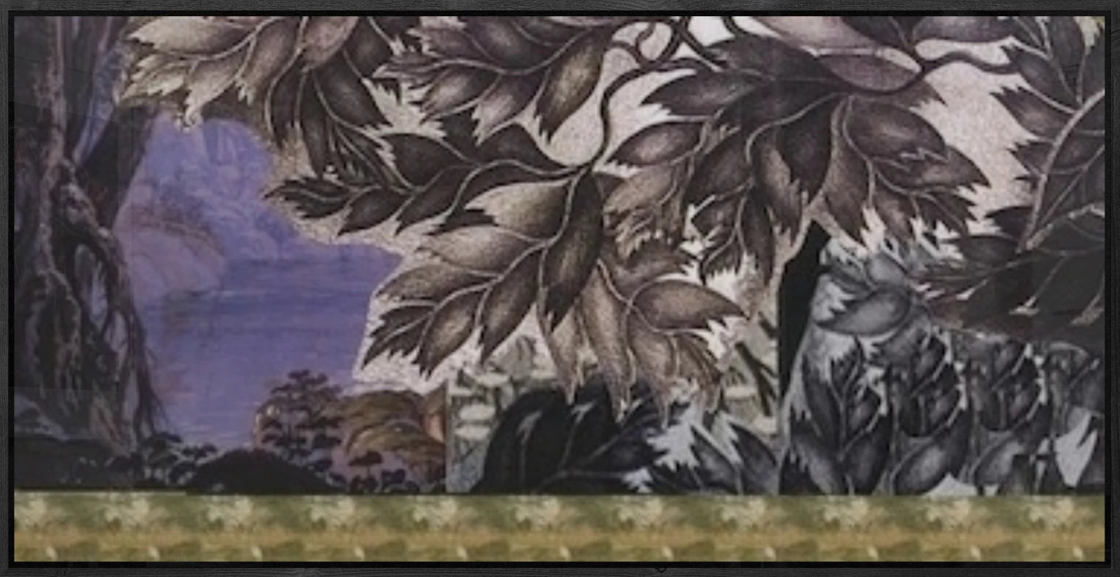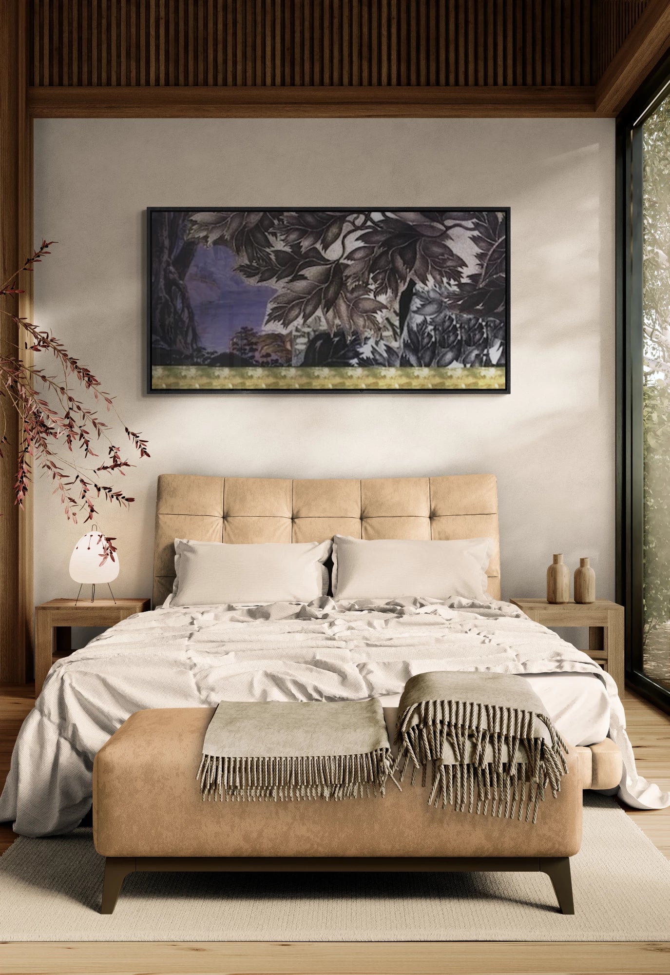 Het kunstwerk Magical Forest Front van kunstenaar Ellen Haeser is een visuele reis naar een dromerige wereld vol mysterie en betovering. Met zijn rijke, gelaagde details roept het werk de sfeer van een magisch bos op, waar schaduw en licht harmonieus samenkomen. Diep donkergroene bladeren omlijsten een landschap dat baadt in paarse tinten, waardoor een zachte, bijna etherische ambiance ontstaat.