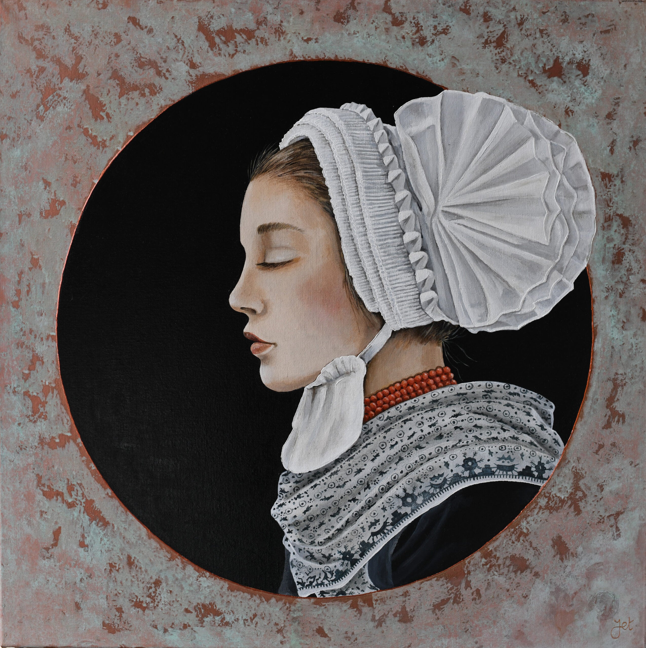 De zwarte houten baklijst omlijst het geheel subtiel en stijlvol, waardoor Janna een verfijnde toevoeging is aan elk interieur. Het werk combineert moeiteloos traditionele schoonheid met eigentijdse kunst.