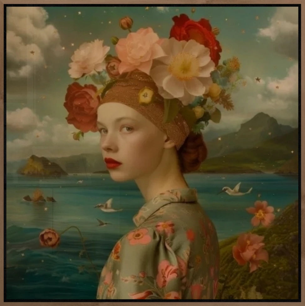 Summer Fantasy van Bas! Dit is een fascinerend portret dat de grens tussen realiteit en fantasie vervaagt. Het werk straalt een romantische en poëtische sfeer uit met zijn levendige bloemenkroon, zacht glooiende landschap en een magische achtergrond die doet denken aan een zomerse droomwereld. De prachtige details en warme tinten brengen een gevoel van sereniteit en verwondering, perfect om een uniek karakter aan je interieur toe te voegen.